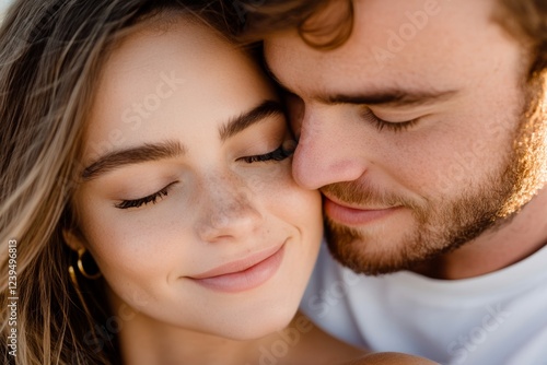 Man and woman are embracing each other, with the woman's eyes closed