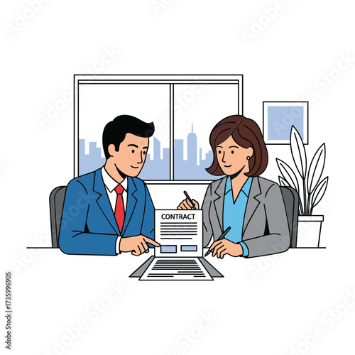 Man and woman in business attire reviewing a contract document at a desk with cityscape background agreement