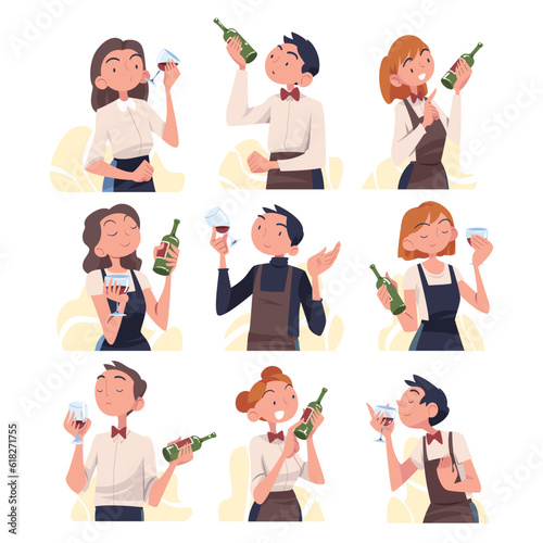 Man and Woman Sommelier as Wine Professional with Glass and Bottle of Drink Vector Set