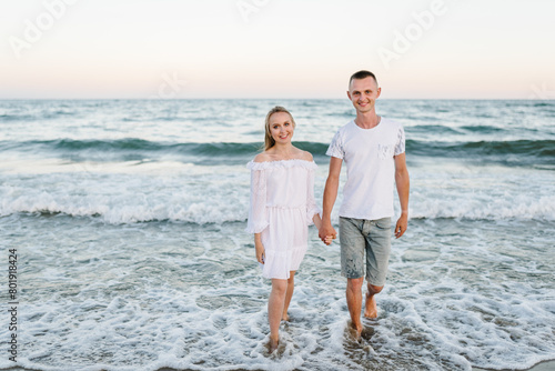 Man and woman walk on water with big waves in sea. Happy couple in love holding hands, looking at camera walking barefoot on seashore. Female and male run on beach ocean. Spending time together