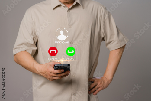 Man answering to incoming call. Phone call from unknown number. Call center gang, scammer or stranger. Hoax person with fake identity. Scam, fraud or phishing with mobile phone or smartphone concept.
