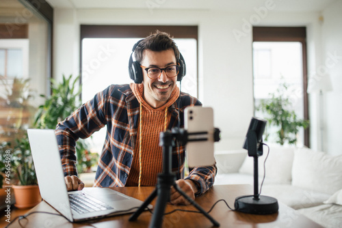 man, mental health, video, podcast, well-being, breathing, exercise, laptop, earphones, meditating, smartphone, microphone, shirt, content, advice, therapy, broadcasting, care, coach, discussion, indoor, follower, tutorial, viral, filming, talking, teaching, inhale, emanating, copy space, individuality, home, mentor, psychotherapy