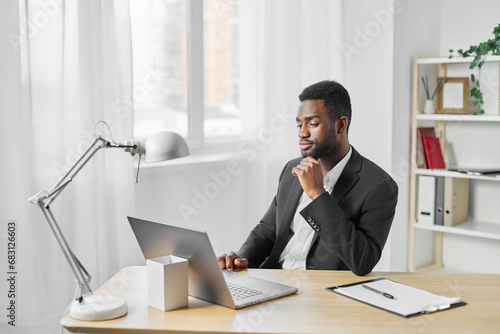 man, laptop, student, freelancer, education, african american, office, online, computer, job, business, desk, table, cyberspace, conference, freelance, male, african, distance, black, men at work, workplace, call, web, businessman, person, programmer, career, chat, smiling, looking, indoor, home, cyberspace, technology, copy space, manager, entrepreneur, american, sitting, blank space, work, employee, corporate, using, communication, young