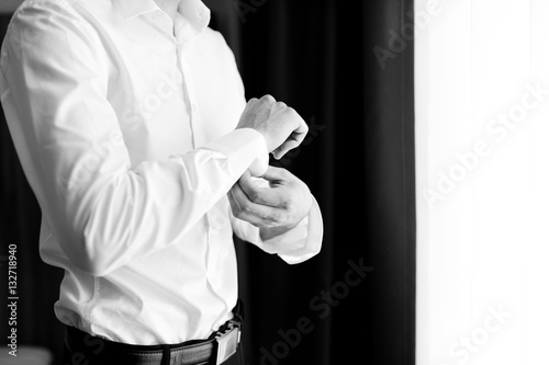 Man buttoning on the sleeve of his shirt. Zip up the cufflink. Men's style.