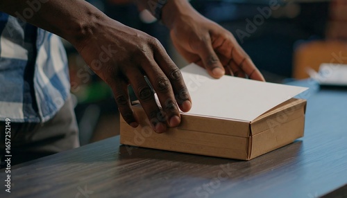 man, opening, box, cardboard, table, card, inside, hand, careful, reveal, anticipation, mystery, package, delivery, shipping, small, wooden, room, light, gift, present, surprise, receiving, order, unpack, unpack, product, commerce, retail, online, sale, closeup, topview, purchase, container, brown, white, paper, postal, service, sending, holding, workspace