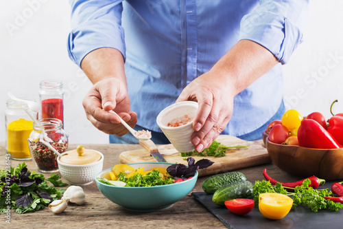 background, bowl, chef, closeup, cook, cooking, cucumber, cookery, cutting, diet, dinner, dish, food, fresh, green, hand, hand, healthy, holding, home, kitchen, knife, lifestyle, lunch, male, man, meal, nourishment, people, pepper, person, plate, preparation, preparing, red, rustic, salad, salt, spice, table, tomatoes, vegan, vegetable, vegetable, vegetarian, view, white, wooden