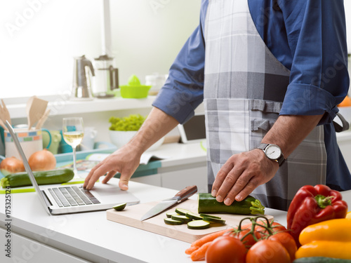 man, kitchen, food, cook, cooking, laptop, receipe, chopping, apron, cutting, vegetable, chef, food preparation, cookery, diet, chopping board, computer, connecting, online, learning, courgette, chopping board, worktop, counter, vegan, hand, searching, vegetarian, clean, homemade, health food, healthy eating, ingredient, meal, lunch, fresh, organic, knife, home, interior, room, lifestyle