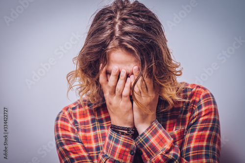 face, cover, isolated, photogenic, model, slim, latin, natural, fun, attractive, gesticulate, silence, expression, dramatic, adult, studio, male, jean, anonymous, clean, 1, caucasian, hide, portrait, eye, beard, shock, young, surprise, close, blue, person, gesture, mouth, blind, worried, secret, fresh, man, mistake, hand