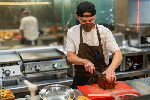 man, cook, kitchen, bread, cut, pandemic, mask, slice, prepare, counter, male, knife, chopping board, protect, food, work, loaf, tied-up, small business, steel, uniform, safety, job, piece, epidemic, professional, process, appliance, apron, virus, occupation, employee, tool, outbreak, cap, profession, at work, looking down, blur