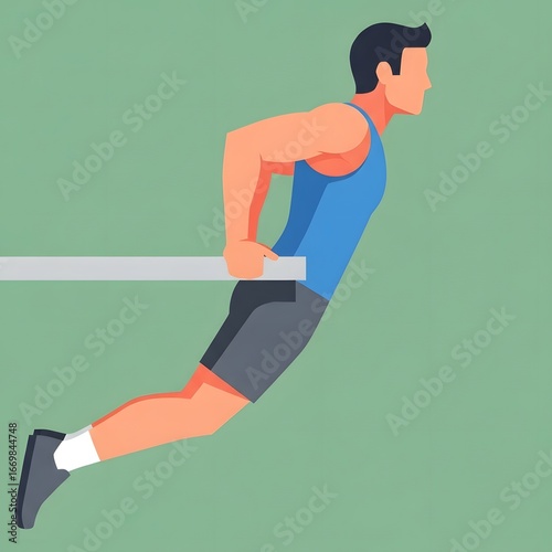 Man doing dips exercise on parallel bars, fitness training, vector illustration.