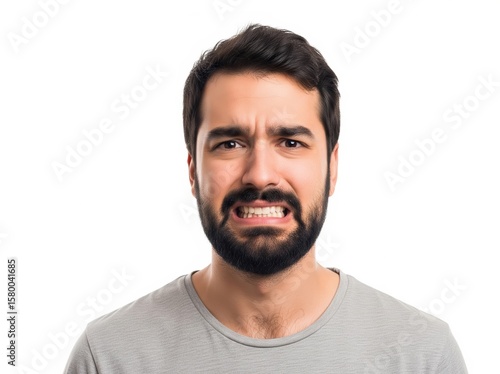 man, angry, teeth, beard, emotion, frustration, expression, casual attire, shirt, white, isolated, regret, desperate, stress, negative, feeling, sad, young, unhappy, male, background, portrait, gesture, despair, disappointment, reaction, face, conflict, frown, reality, doubt, tension, problem, shock, bruised, grit, annoyed, worried, troubled, distraught, fear, internal, moody