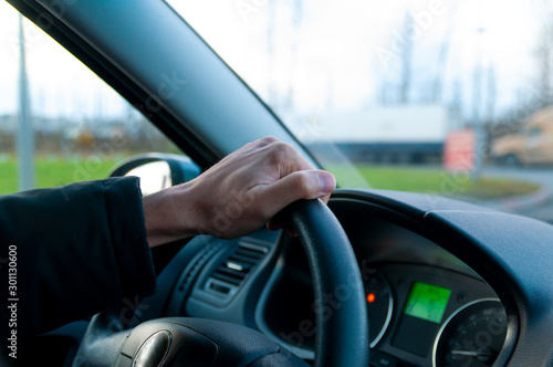 man driving a car. male hand on a car steering wheel