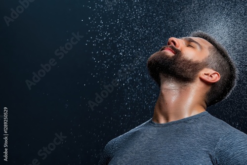 man, joy, water, droplet, beard, dark background, refreshing, emotion, expression, serenity, closeup, beauty, happiness, relaxation, calm, lifestyle, mood, moment, masculine, wet, skin, cool, leisure, playfulness, peace, spraying, lighting, atmosphere, solitude, facial expression, exhilaration, enjoyment, feeling, surface tension, portrait, creative