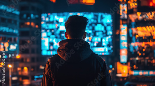 man, digital, billboard, night, silhouette, glowing, urban, nightlife, city, light, bright, colourful, advertising, media, display, screen, illuminated, neon, downtown, technology, metropolis, vibrant, street, modern, city landscape, evening, skyscraper, futuristic, commerce, marketing, crowd, atmosphere, tied-up, lifestyle, electric, panorama, commercial, architecture