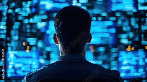 Man facing multiple blue digital screens, experiencing technology and innovation
