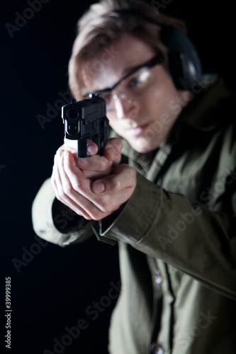 aiming, black, background, caucasian, earplugs, goggles, handgun, horizontal, man, marksman, marksmanship, handgun, pointing, revolver, shooting, shooting gallery, target, sport, young, load, bullet, lead, hand, sharpened, accuracy, training, skill, hobby, indoor, male, eye, ear, protection, shot, agent, firearm, military, ballistic, range, firing