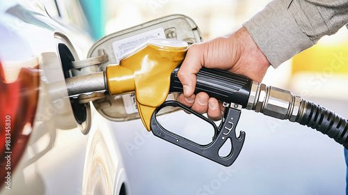 man hand holding a gas pump nozzle and filling up a car at the station is using a fuel benzin