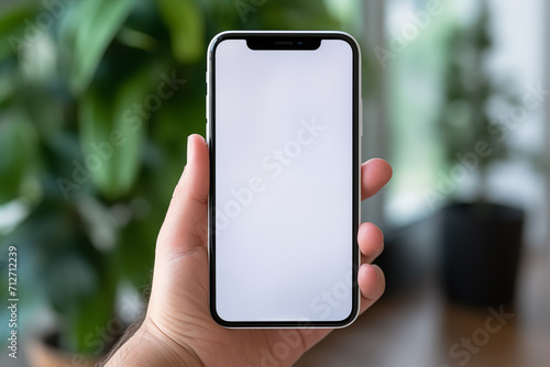 man hand holding phone with isolated screen in room house. cell phone blank white screen mockup.