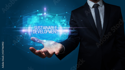 Man hand holding SUSTAINABLE DEVELOPMENT inscription, technology concept