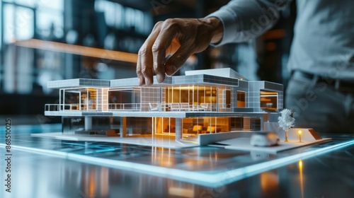 Man hand near a concept hologram render model of a real estate house on a table in an agency , futuristic business concept.