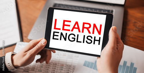 Man hands holding tablet with text Learn ENGLISH at workplace. Businessman working at desk with documents. study and education concept