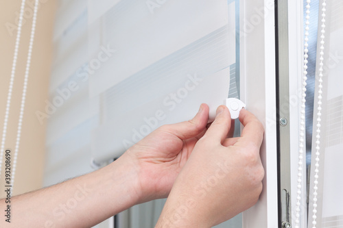 curtain, shutter, fabric, window, open, close, white, duet, striped, curtain, system, setup, install, fixing, ceiling, hand, installation, fix, installing, repair, sunlight, modern, sun, shutter, light, shade, service, cosy, shadow, day, night, decoration, building, closeup, protect, construction, indoor, retractable, covering, roller, background, home, room, house, protection, blind