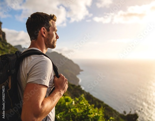 man, hiking, ocean, mountain, sunset, view, travel, adventure, nature, landscape, sky, cloud, horizon, calm, exploration, freedom, perspective, traveler, journey, relaxed, sunlight, top