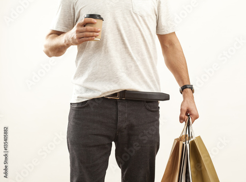 shop, shopping bag, packet, package, shopping, bag, man, hand, holding, paper, pack, cardboard, fashion, client, buy, buyer, person, buying, consumer, young, leg, carrying, jean, casual attire, sale, male, hot drink, drink