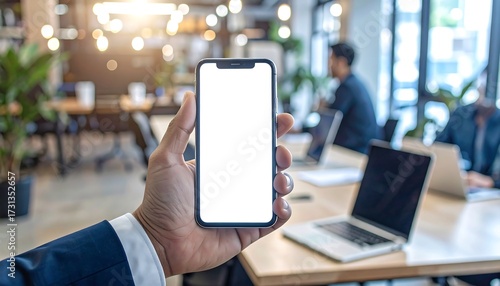 smartphone, office, business, technology, screen, hand, mobile, communication, device, work, corporate, modern, digital, cyberspace, display, electronic, connection, network, application, innovation, cellular, portable, wireless, contraption, closeup, person, male, employee, professional, workspace, desk, laptop, indoor, interior, blur, background, sharpened, presentation, template, advertisement, marketing, promotion, blank, white
