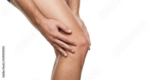 Man Holding Sore Knee Dry Skin White Background - A man gently holds his knee, showcasing dry skin around the joint. The symbolizes pain, discomfort, dryness, health, and the need for skincare