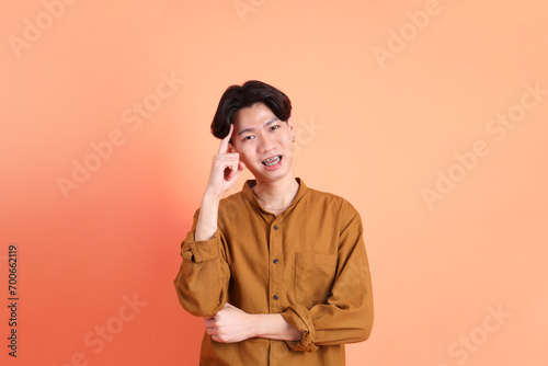 braces, person, teeth, orthodontic, mouth, health, male, man, young, asian, background, isolated, photogenic, colours, pink, orange, accessory, fashion, 20s, thinks, looking, idea, positive, finger, clever, choice, attractive, expression, inspiration