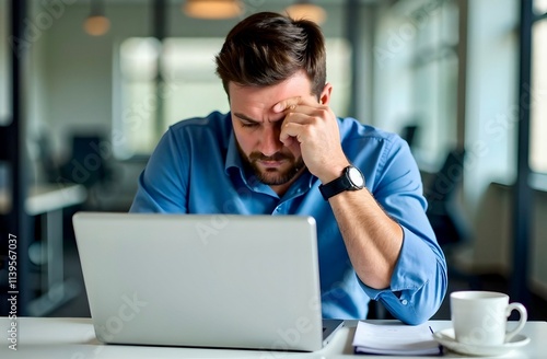 Man in a blue shirt is concentrating on his laptop, stressed and struggling with professional tasks, in a bright, modern office environment