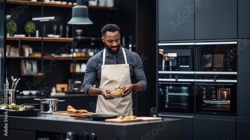 Man in apron preparing food in modern kitchen with sleek appliances and dark cabinetry, standing at countertop with bread and vegetables