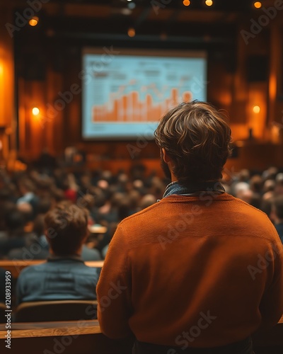 presentation, audience, conference, seminar, lecture, meeting, business, datum, graph, chart, people, person, man, back, view, crowd, room, hall, auditorium, theatre, stage, screen, projector, light, wood, seat, row, hearer, speaker, watching, observing, learning, education, information, analysis, statistic, growth, progress, trend, technology, event, corporate