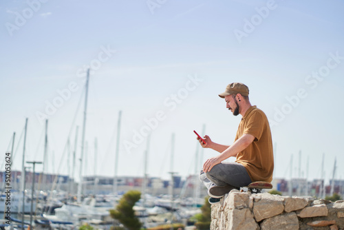 person, skateboard, man, phone, technology, lifestyle, sitting, cap, sport, skater, portrait, mobile, urban, hobby, summer, city, young, fun, adult, street, style, modern, cool, caucasian, relaxing, board, guy, bench, horizontal, sunlight, resting, photo, alone, casual attire, cheerful, waiting, looking, shirt, pensive, serious, happy, color image, male, activewear, expression