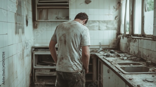 man, kitchen, dirty, dilapidated, ruined, messy, abandoned, destruction, despair, grieved, sorrowful, grief, loss, poverty, homelessness, alone, solitary, damaged, broken, neglected, unclean, grime, dirt, dust, debris, wreckage, building, room, house, home, interior, space, apartment, dwelling, structure, environment, person, male, adult, back, view, standing, looking down, hopelessness, desolation, misery, devastation, trauma, crisis