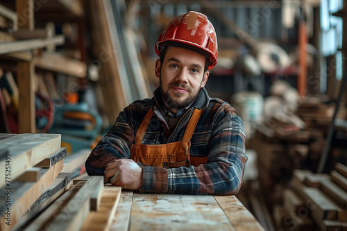 Man in hard hat and overalls woodworking shop, indoors white ethnicity male work tool