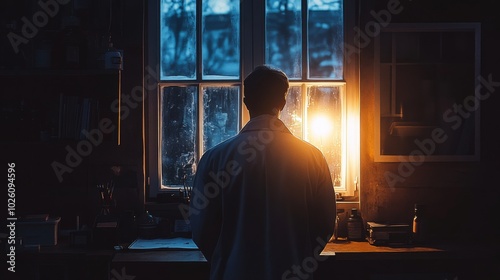 silhouette, window, sunrise, scientist, laboratory, contemplation, backview, solitude, morning light, research, science, innovation, workspace, creativity, inspiration, peaceful, thinking, sharpened, scholar, academic, study, discovery, quiet, concentration, natural light, dawn, early morning, chemistry, physics, biology, desk, introspection, thoughtful, idea, calmness, serene, learning, cognition, exploration