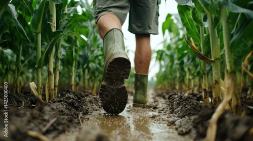 Man in olive boots walking on soaked soil between corn rows after heavy rain