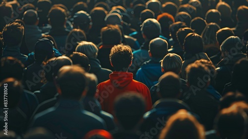 man, red, jacket, standing, crowd, people, standout, unique, individual, contrast, attention, different, distinct, bold, singular, isolated, visible, prominent, striking, highlighted, distinctive, exceptional, eye-catching, focal