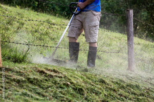 mowing, grass, lawn, trimmer, man, rubber, boot, garden, gardening, work, nature, gardener, farmer, men at work, agriculture, outdoors, spring, field, activity, tool, summer, farm, fence, barbed wire, autumn, cutting, trimming, short, working, person, cutter, engine, machine
