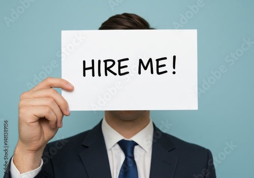 Man in suit holding "hire me!" sign covering face