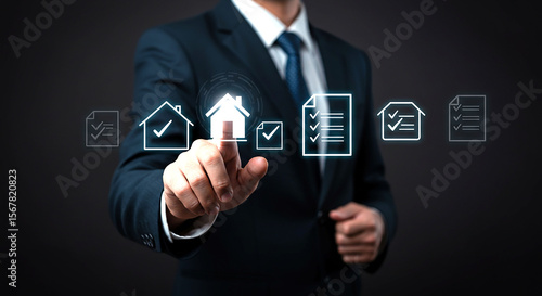 man, suit, attaching, finger, house, icon, document, check, list, screen, dark, background, glowing, technology, business, property, real, estate, agreements, contract, approval, selection, interface, touch, concept, modern, digital, presentation, corporate, professional, finance, investment, management, planning, strategy, success, solution, innovation, future, growth, market, sale, purchase, loan, mortgage, insurance, offer, deal, transaction