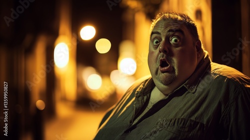 shock, surprise, fear, urban, night, street, man, reaction, emotion, illumination, portrait, bokeh, light, expression, disbelief, unexpected, city, outdoors, dramatic, surreal, unusual, ambience, human, wide, colours, responding, curiosity, depth, contrast, lighting, genuine, spontaneous, situation, high-coloured, intense, closeup, gritty, realistic, odd, individual, culture, social, scene, unconventional, atmosphere