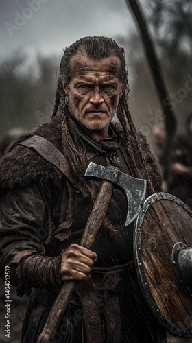 ai, generated, viking, warrior, axe, shield, battle, costume, long, hair, braided, historical, detailed, cinematic, background, menacing, expression, leather, paint, high, resolution, professional, conflict, chaos, landscape, fierce, ancient, realism, man, storm, intensity, character, culture, dramatic, tradition, armoring, artistry, craftsmanship, epic, visual, storytelling, imagery, generative