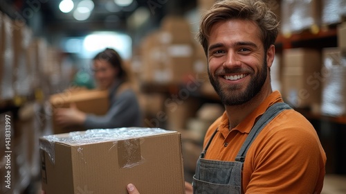 Man in warehouse holding box smiles with blurred person and boxes behind.