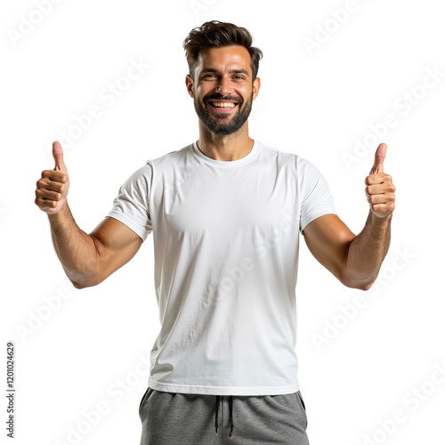 one person, adult, man, thumb up, smiling, white shirt, athletic, gesture, beard, dark hair, indoor, light background, positive, 20s, 30s, day