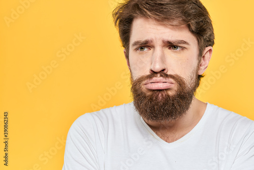 Man in white t-shirt emotions studio gestures with hands displeased facial expression yellow background