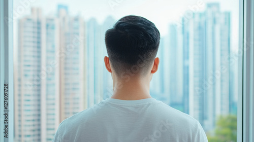 man, office, city, skyline, building, contemplation, urban, view, back, hair, modern, architecture, window, lifestyle, professional, solitude, perspective, asian, adult, male, casual attire, shirt, tower block, landscape, environment, city landscape, day, nature, business, career, sharpened, thoughtful, residential, metropolitan