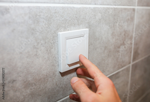Man is switching off the lights. New sockets on the white wall. Details after renovation. Restoration process in the flat.